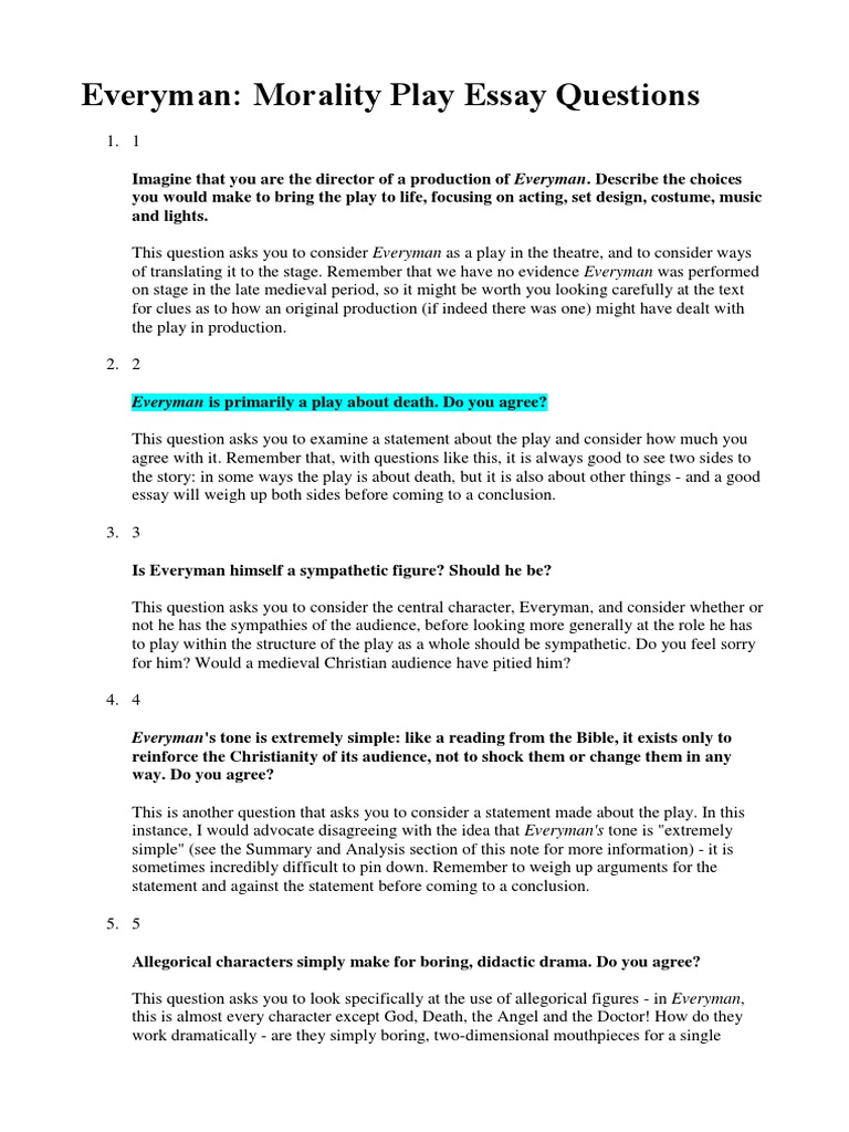 Everyman Play Essay Words 6 Pages. The Everyman Everyman essay is a morality play that became popular after the Corpus Christi Plays were banned in the 15th century. The play was written by an unknown author, everyman essay, but many Historians believe that the author was probably a priest or monk as they were the people who usually wrote religious and moral dramas, everyman essay.